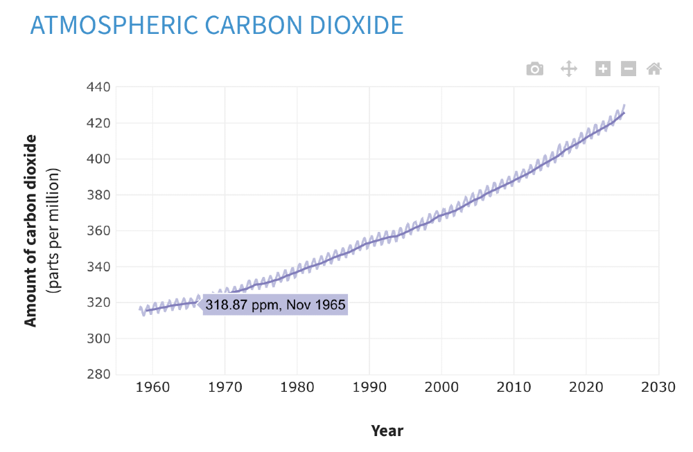They estimated that a 25-percent increase in atmospheric CO2 "compared to the amount present during the 19th century" could yield a temperature increase between 0.6° Celsius and 4.0° C (1.1° F to 7.2° F). They guessed that milestone would arrive around the turn of the century — they were wrong. In November 1965, the concentration of atmospheric CO2 had risen from that pre-industrial level of about 280 parts-per-million to 319 ppm; it crossed 350 ppm, that 25 percent threshold, in 1988. Today it sits at 425 ppm, more than 50 percent higher than before humans got busy burning things.