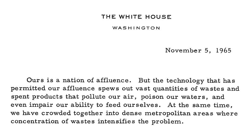 In releasing the entire document to the public, the president of the United States included an introductory letter. "Pollution now is one of the most pervasive problems of our society," he wrote. The rise in such filth sent skyward and into water supplies, he went on, "is so rapid that our present efforts in managing pollution are barely enough to stay even, surely not enough to make the improvements that are needed." And finally: "Because of its general interest, I am releasing the report for publication." The date on that letter was November 5, 1965.